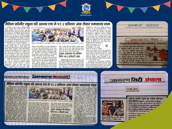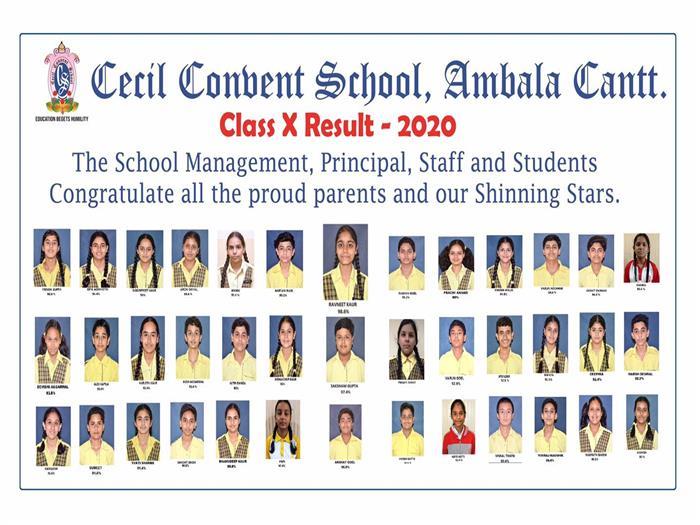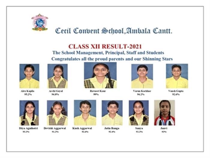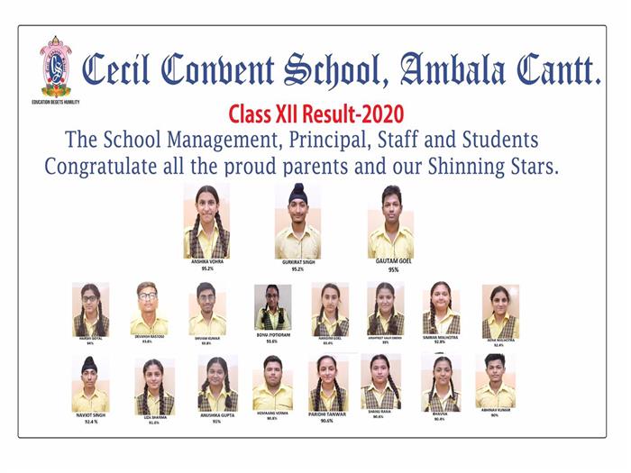 Cecilians of Cecil Convent School, Ambala Cantt have brought laurels to the school, by showing incredible performance in their 12th Board Exams.The students have proudly added another feather to their caps by passing with flying colours. The toppers of Science stream are Anshika Vohra and Gurkirat Singh 95.2%, Gautam Goyal 95% and Simran Malhotra 92.8% From Commerce stream Harshi Goyal 94%, Devansh Rastogi and Shivam Kumar 93.8%, Bonu Jyothiraman 93.6% and Nandini Goel--93.8% The school has bagged many distinctions and 19 students scored above 90% with no second and third division and also a cent percent result. The Management Committee and the Principal George Daniel congratulated the students, parents and all the staff members for their wholehearted efforts, dedication and hard work in bringing such a fabulous result!